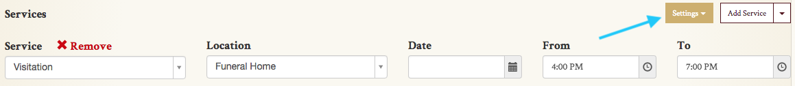 Click the “Settings” button in the “Services” section of the obituary form.