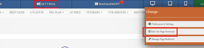 Pages can easily be organized or added in the navigation menu of the website via the "Edit Site Page Structure" page. To navigate to this page, click the settings button at the top of the website and select "Edit Site Page Structure".