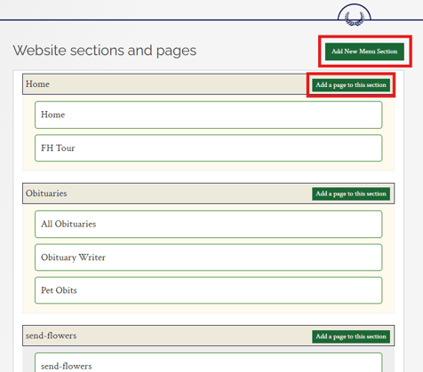 On the edit site structure page, pages will be listed out in the layout that they appear within the websites navigation menu. All pages will fall under a section, the sections are the top level label that shows in the navigation menu and the pages under that section are the pages that appear in the menu drop down when navigating the website menu. Sections can be added to the menu via the "Add New Menu Section" button in the top right, pages can be added to the sections via the "Add a page to the section" button for each section.