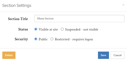 When adding a section, options are available to add a section title, set a status for if the section should appear in the menu or be suspended and security options if you want the page to be public or password protected. To edit an existing section, simply click on the section name.