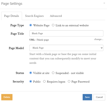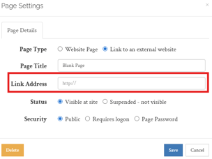 - Page type can be set to Website Page to add a standard website page or external to add a page that links out to a different website. If you are adding an external link page, the Link Address option will appear where you can enter the link you want the page to go to.