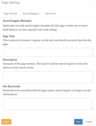 - The search engines tab gives you the ability to customize the meta data for a specific page. Page title, description and keywords can all be customized. These meta data properties are used by search engines to better understand the content on your website page and rank it appropriately in search results.