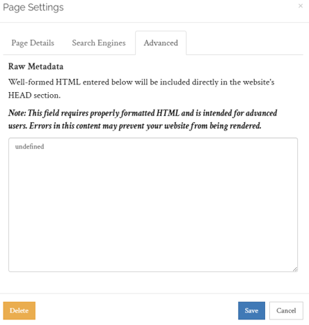 - The advanced tab allows you to add custom HTML code to a page header. It is not advised to add anything in this section unless you understand how to properly format HTML code. Improperly formatted HTML can cause your site to not work properly.