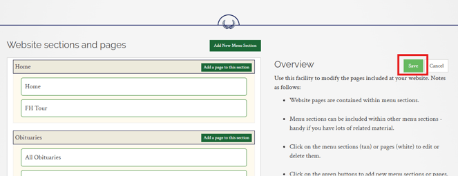 Once you have made all your changes to the website sections and pages, make sure to click the green save button in the overview area to save the changes to the live website.