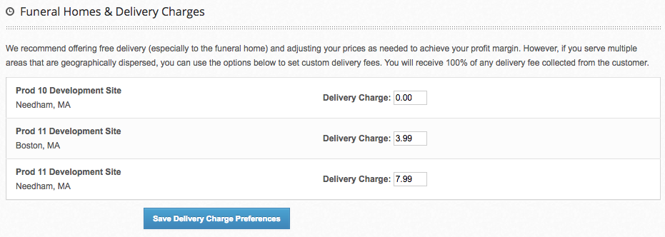 When attached to a funeral home website, the funeral home and town will be listed underneath “Funeral Homes & Delivery Charges.” If you serve multiple funeral homes, they will all appear in this list. You can add different delivery charges to each funeral home, with each starting at your default price.