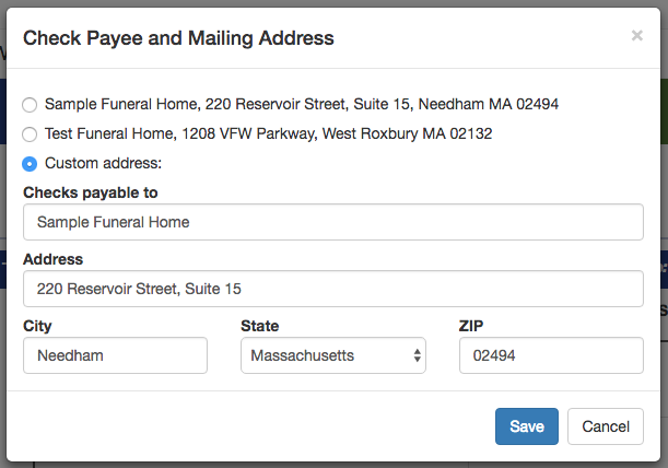 Below the bar graph, you will see a blue box that says “Mail checks to.” You should see your funeral home address in this box if you have not changed the address previously.