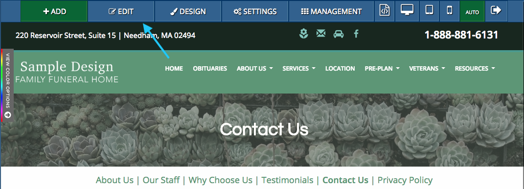 Navigate to the contact page on your website. Our stock ‘contact us’ page has a basic form that can be edited if needed. Click on the “Edit” button in the bar at the top of the page.