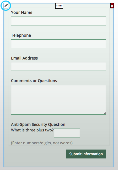 Next, hover your mouse over the contact form. You will see the form highlighted in a blue outline with three buttons at the top. Click on the pencil button in the top left corner of the form.