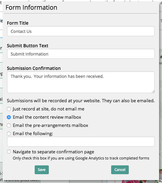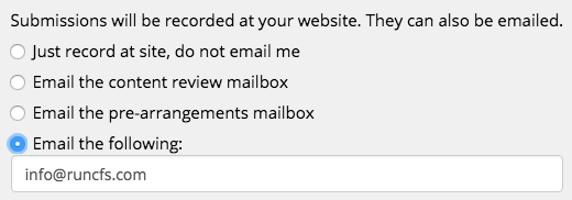 A pop-up box will appear on your screen. At the bottom, you will see where submissions will be emailed. You can have messages sent to the content review or pre-arrangement mailboxes. Alternatively, you can enter an email by clicking the bubble next to “Email the following.”