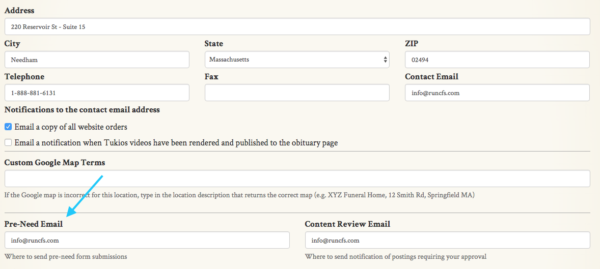 At the bottom of the page, you will see two fields for email addresses: Pre-Need and Content Review. Enter the desired email address in the space below “Pre-Need Email” You can add multiple addresses by separating each with a comma.
