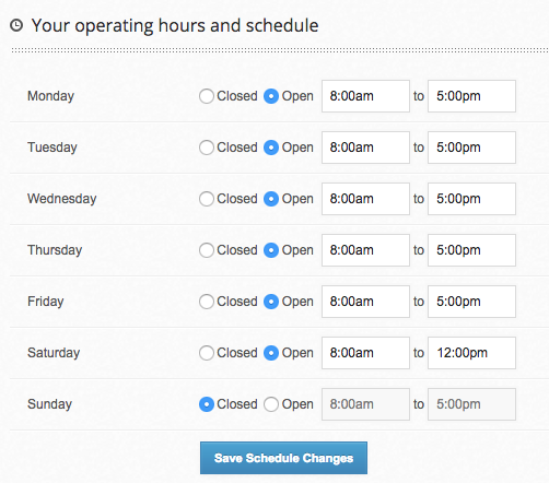 Scroll to the bottom of the page. The last item is “Your operating hours and schedule,” where you can enter in your hours. Be sure to click the “Save Schedule Changes” at the bottom of the section to update your record. These hours can be changed at any time and are used to determine whether or not you can receive orders for upcoming services.