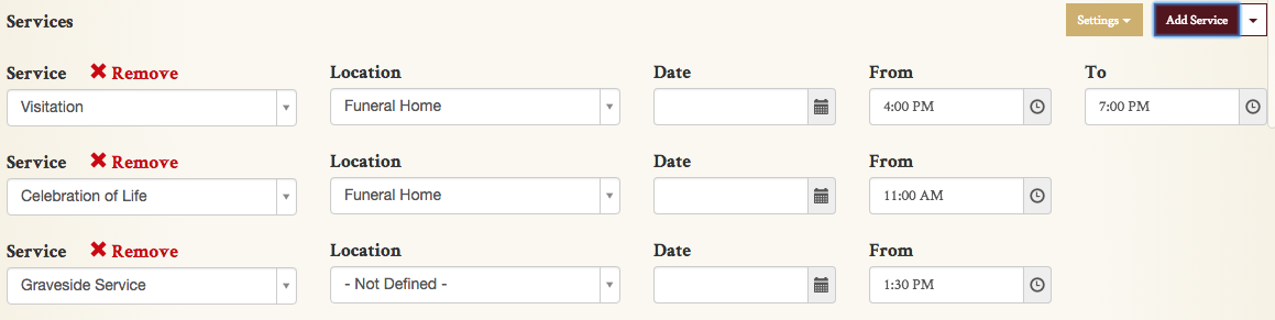 Now when adding a new obituary, the visitation and celebration of life are automatically added under the “Services” section. When a new service is added, it will default to the other service specified in settings.