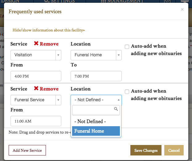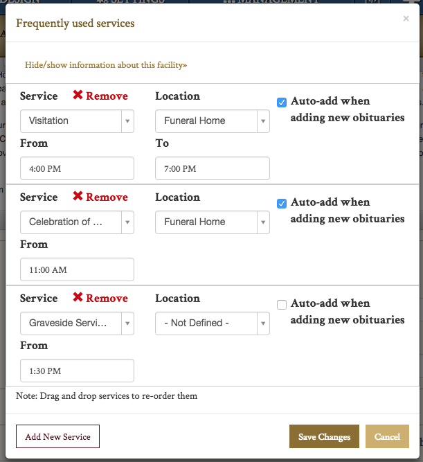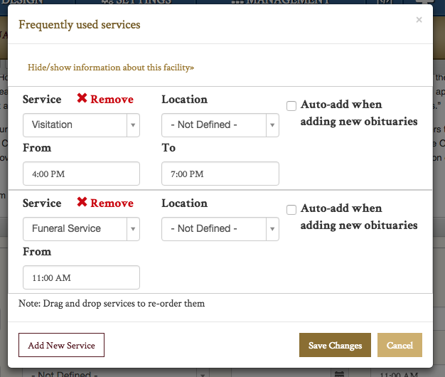 When adding services to an obituary, you may notice that the first two service types are “Visitation” and “Funeral Service.” By default, these two service types are defined under the “Frequently Used Services” feature. This feature is designed to help streamline the process of adding obituaries, especially if the majority of new listings have the same service types.