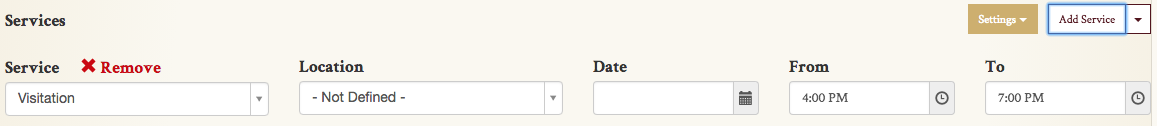 A pop-up box will appear on the screen. Here you can set default values for service type, location, and time(s). When you add a new service, it will match the services defined but can be fully edited as needed.