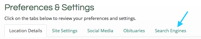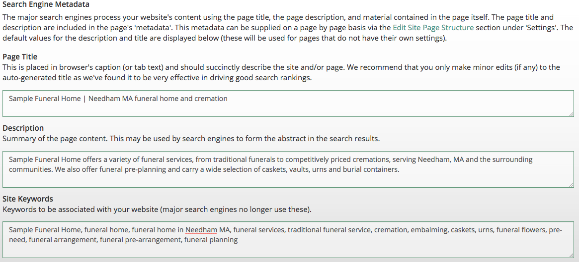 In the “Search Engine Metadata” section, enter custom text for the page title, description, and keywords. Keep in mind that this will affect all pages without custom descriptions. Do not use specific page names in this section, such as “Obituaries” or “Home.”