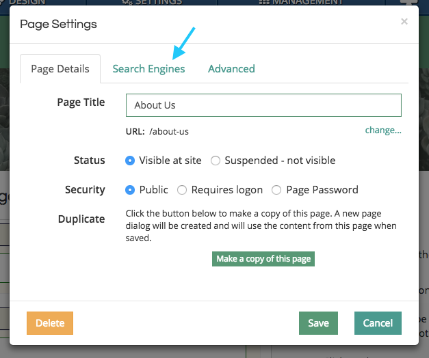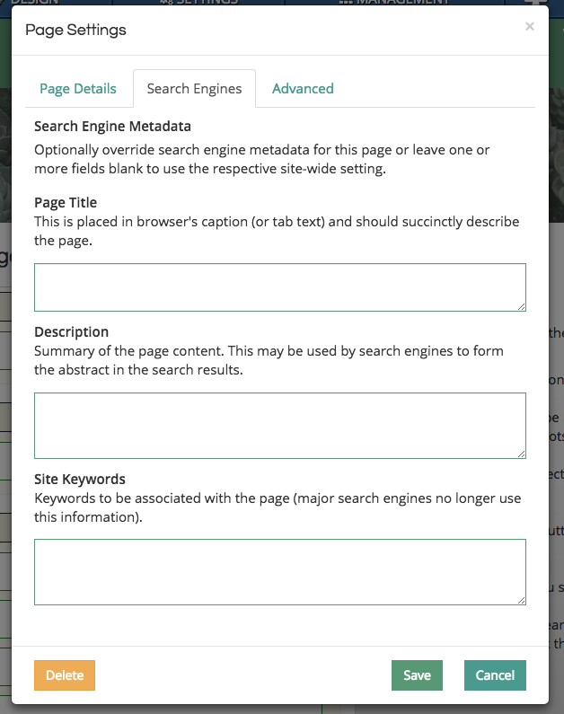 On this page, you can enter a custom page title, description, and a list of keywords. Most major search engines, such as Google, no longer use keywords. If these boxes appear blank, it is using the default text set in site settings. Click “Save” to update your website’s metadata.