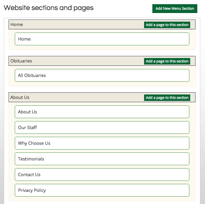 On the left side of the page, you will see website sections. The white boxes inside each section are individual pages. Click on the page you would like to add a custom description to.