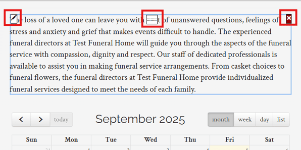 Just like smart objects and sections, the obituary objects can be dragged and dropped on the page. A variety of obituary objects are available to add different styles of obituary listing, obituary search bars and the obituary alert sign up. The pencil icon in the upper left will let you customize the obituary object settings and stylings.
