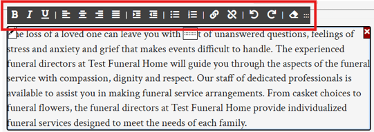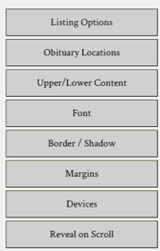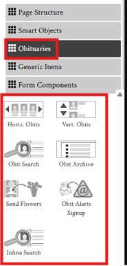Obituary related objects can be added to the page via the "Obituaries" tab on the site editor.