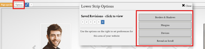 Some page areas like the header and footer will have an option button available that allows for some design settings to be changed for that area on the page or site-wide. Styling options for borders or shadows, margins, device views and scroll settings are all available in this window. A save revisions option is also available if you would like to restore previous versions of the area, 6 previous revised versions of the area will be stored here incase you need to restore a previous version.