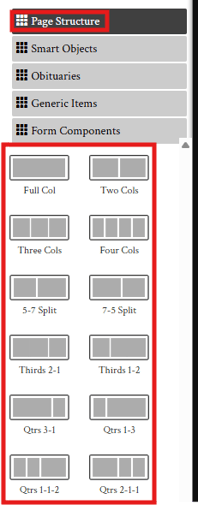 The design bar on the left side of the page editor has an option for page structure that allows you to add various types of columned sections to the page. These columns are areas that content elements can be placed within. To add a section to the page, simply click on the desired section type and drag/drop it on the page where you want it.