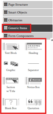 A number of generic items are available to add to the page under the generic items tab of the editor sidebar.