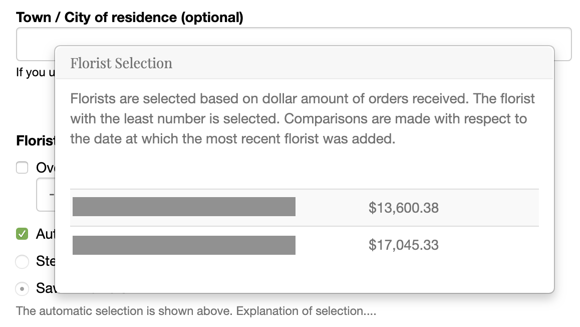 Hovering over the text below "Florist Selection" will display a pop-up window that shows the sales volume of each florist on your website. The florist with the least sales will be the default selection on the next obituary posted.