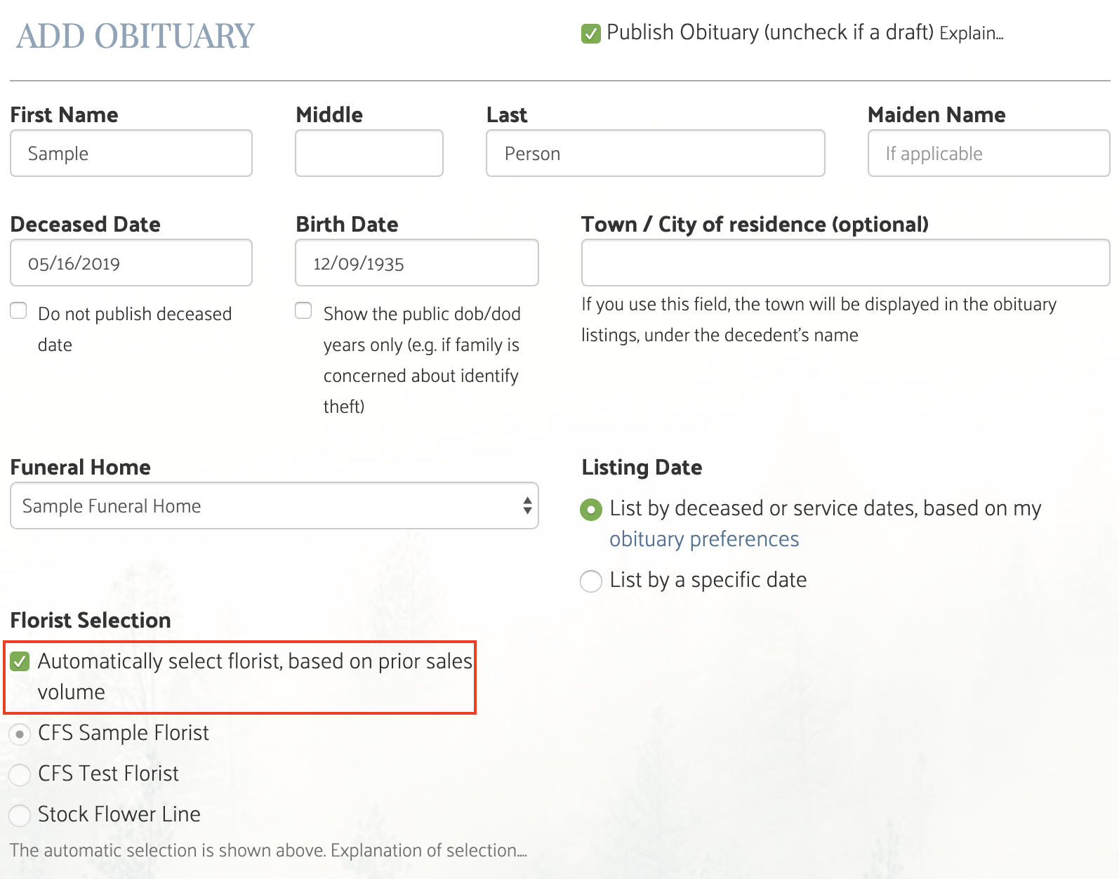 If needed, you can override the system and assign a specific florist to an obituary. When adding or editing the obituary, there is a "Florist Selection" section. Uncheck the box next to "Automatically select florist."