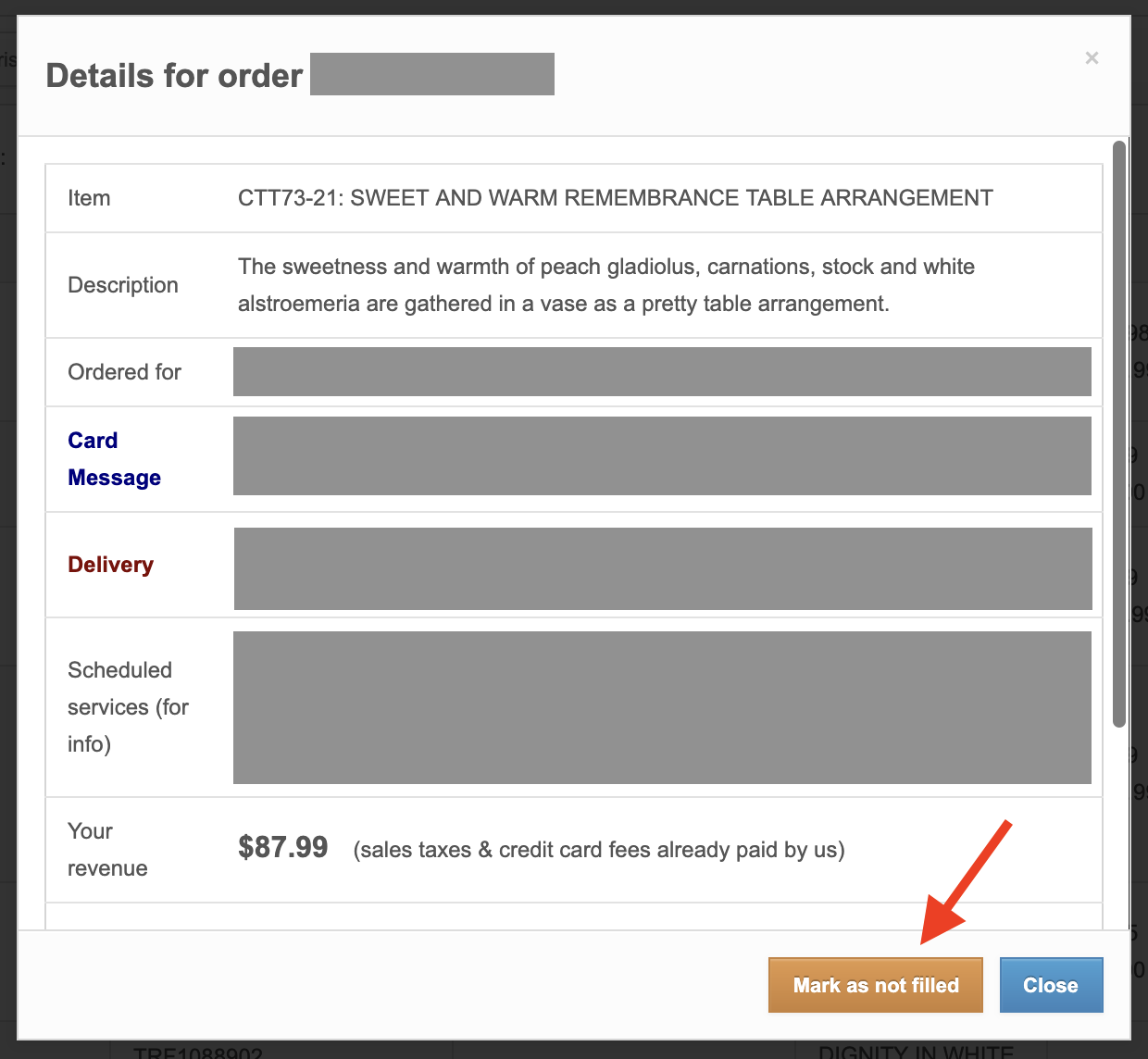 If you accidentally mark an order as filled, you can remove the "filled" status. Click the "View" button again to bring up the order window. An orange "Mark as unfilled" button will appear in the bottom right where the "Mark as filled" button was placed. Orders can be toggled between filled and unfilled at any time.