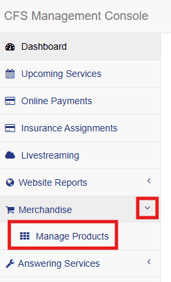 Product lines and merchandise products can be added to the website via the manage products page. To navigate to this page, click the management button at the top of the website, select the merchandise option in the sidebar menu and click on "Manage Products".