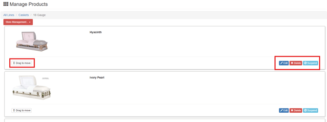 Just like the categories, there will be options on the right side to edit, delete or suspend the product from displaying on the website. There is also a drag to move button on the left side to order your products.