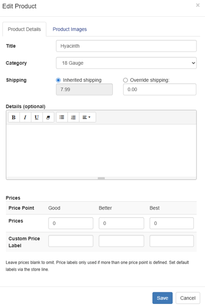 On the edit window for a product, title, category and description information can be entered along with shipping and pricing amounts. An image for the product can also be added via the product images tab.