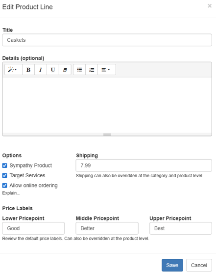 When editing a product line's information, title and description details can be entered along with shipping and price point information for the products in that product line.