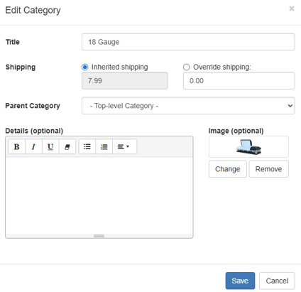 When editing a category, options are available to add a title, description, category image, and shipping information for the category of products. The parent category selector is also available if you need to make this category into a sub-category.