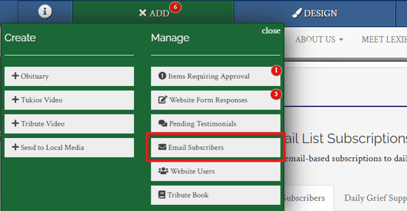 CFS websites offer email-based subscriptions to daily grief support messages and obituary posting alerts. To view or manage your subscriber list, click the green add button at the top of the website and select the "Email Subscribers" option.