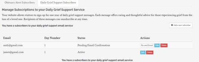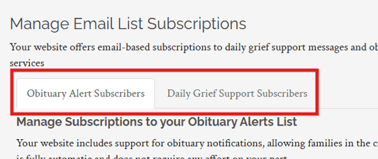 On the email subscriptions list page, tabs are available to navigate between Obituary Alert Subscribers and Daily Grief Support Subscribers.