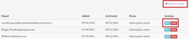 Subscribers will be listed out showing their email, date added, date activated and a note to indicate if their subscription is currently active. Options are available to edit or delete the subscriber and an option is available at the top to manually add a subscriber to the list.