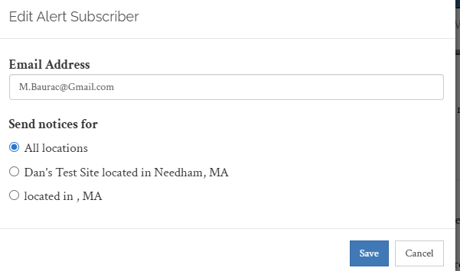 When editing an Obituary Alert Subscriber, the email address can be changed and options are available to set specific locations for alerts if desired.