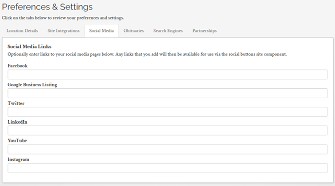 Social Media Links can be added for Facebook, Google Business, Twitter (X), LinkedIn, YouTube and Instagram. These links will display on your website where social media components are displayed, linking visitors to your corresponding pages.