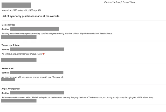 When logged into your website, you can view a printable list of all flowers and sympathy gifts for each obituary. The product name, card message, and sender information are included for thank-you notes and reference for the family.