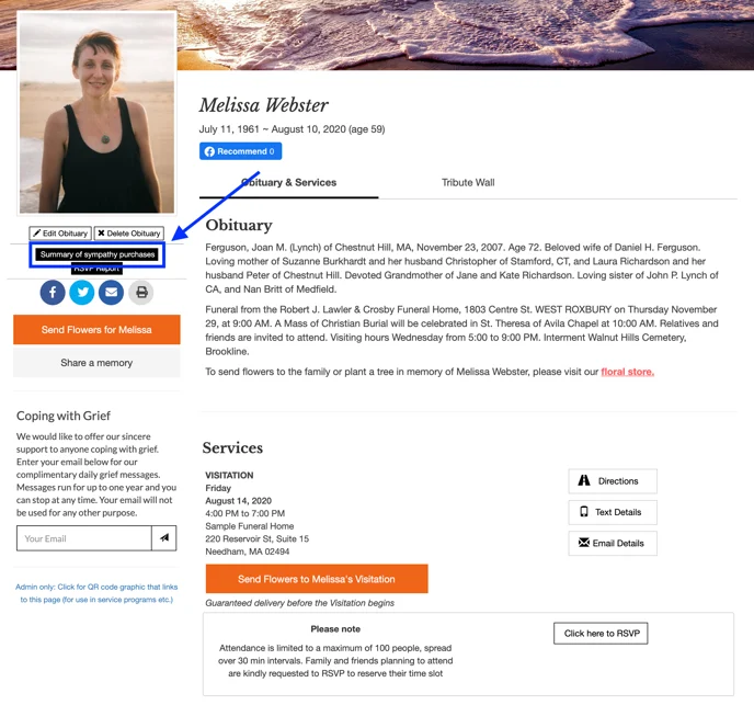 To view a list of all sympathy purchases, click the button beneath the obituary photo.