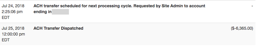 Your request will then be scheduled for the next processing cycle and listed on your statement. ACH payments are dispatched every Wednesday at noon (EST). Funds will appear in your account on the next business day.