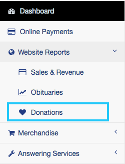 From the sidebar on the left of the page, click on the “Website Reports” button. Click on “Donations” at the bottom of the drop-down menu.