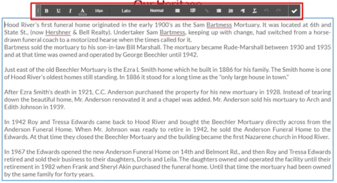 Use the inline editing options in the bar above the paragraph to edit text styles, sizes, fonts, alignment, or add links.