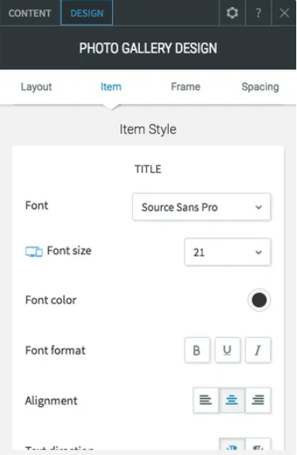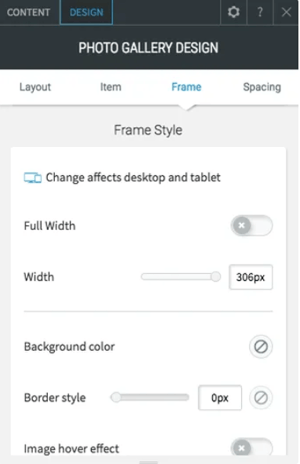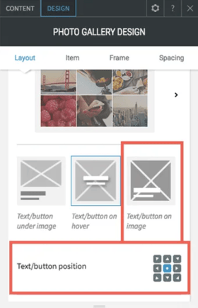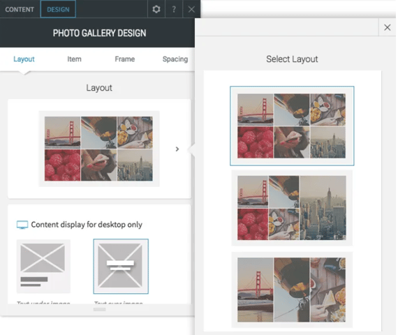 To change the Photo Gallery layout, open the Design Editor and click the Layout section. We have multiple layouts to choose from to provide more design options to your Photo Galleries. Layouts are managed per-device and based on the current view in which the layout is selected. Note that some layouts are only available in the new Photo Gallery widget.
