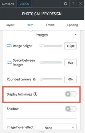 You can change the image height and spacing between the images. Note that this is only applicable for certain layouts. You can also add rounded corners, display the full image on the gallery, add shadows, and change the image hover effect and animation.