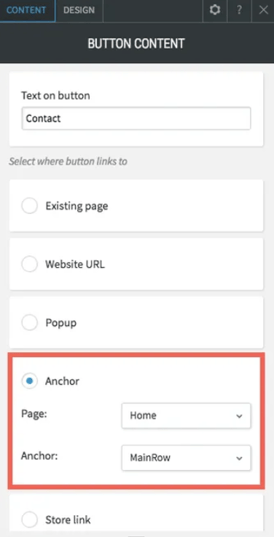 When creating a text or button link, select the Anchor option. Choose the page you creating your anchor on then the anchor name.
