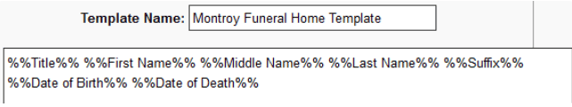 To create the obituary text body, simply enter the text you would like to appear. Wherever client information needs to appear in the body, just click on the name of the field from the lists on the left and it will automatically be placed at the current cursor position. The field name will appear with double percentage characters around the name.