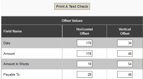 Enter the horizontal and vertical offsets for each items. This is necessary to account for the differences in printers and checks/cheques used. It may take some trial and error to ensure the checks/cheques print correctly.