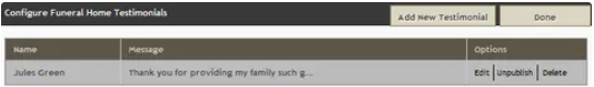 Once a testimonial is added, the options to edit, unpublish, or delete are available.
